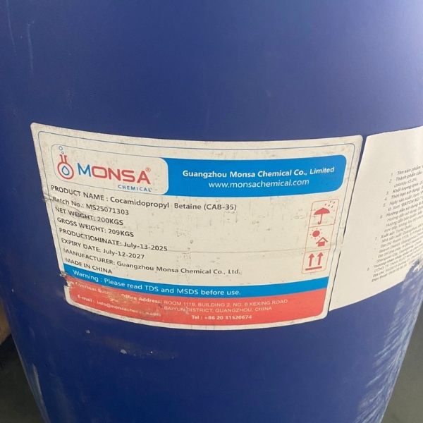CAB-35 của Guangzhou Monsa Chemical Co., Ltd được đóng phuy 200 kg, đạt chất lượng ổn định, phù hợp trong sản xuất mỹ phẩm, chất tẩy rửa và các sản phẩm chăm sóc cá nhân.